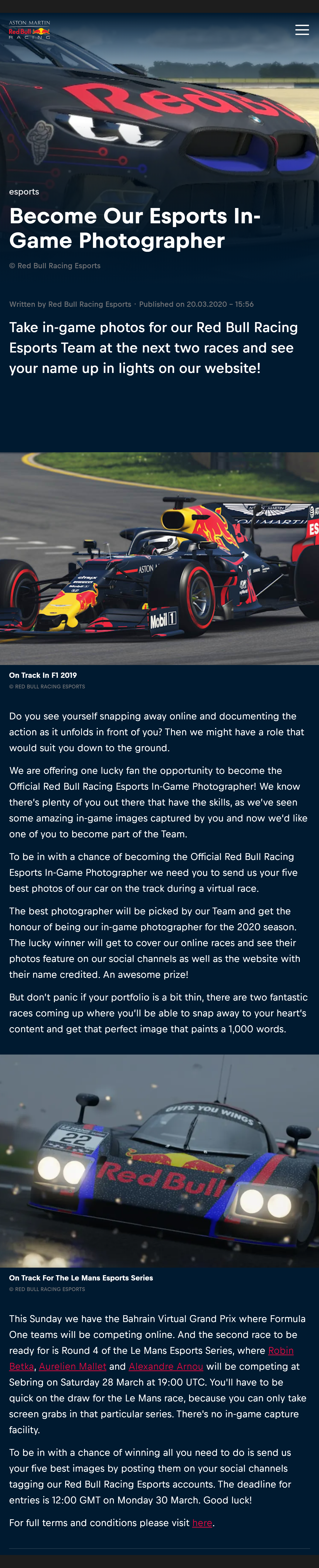 Celle-ci est édité pour l’écurie de Esports F1 Red bull et est disponible sur le site officiel de la marque https://www.redbull.com/. Il a pour vocation de faire gagner l’opportunité d’être l’in-game photographe officiel pour la partie e-sport de cette écurie. Si l’offre est tournée de telle manière à ce qu’on parle plus de volontariat pour un passionné que d’un vrai travail rémunéré de manière classique, la partie ‘conditions’ de l’offre nous montre qu’il s’agit plutôt de quelque chose qui est pris au sérieux comme on le ferait dans une offre plus classique.